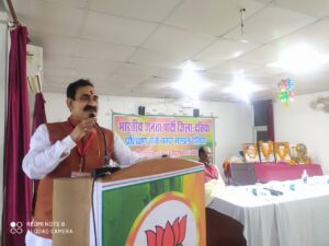 दतिया. भाजपा के दो दिवसीय नगर मण्डल प्रशिक्षण वर्ग का उद्घाटन गृहमंत्री डाॅ. नरोत्तम मिश्रा ने रविवार को स्थानीय निजी कॉलेज में किया। कार्यक्रम की अध्यक्षता भगवान सिंह कुशवाह ने की। गृहमंत्री डाॅ.मिश्रा ने प्रशिक्षण वर्ग में उपस्थित कार्यकर्ताओं को संबोधित करते हुए कहाकि भाजपा का कार्यकर्ता पार्टी की रीढ़ है। कार्यकर्ता की मेहनत का फल है कि आज भाजपा पूरे भारत वर्ष में सबसे बड़ी पार्टी है। दिन भर चले प्रशिक्षण वर्ग में काफी संख्या में भाजपा के पदाधिकारी और कार्यकर्ता मौजूद रहे।