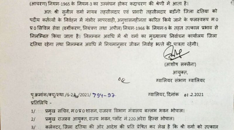 Read moreदतिया । जिले की बड़ौनी तहसील में गृहमंत्री डा.नरोत्तम मिश्रा के एक कार्यक्रम में तहसीलदार सुनील वर्मा को अनुपस्थित रहने