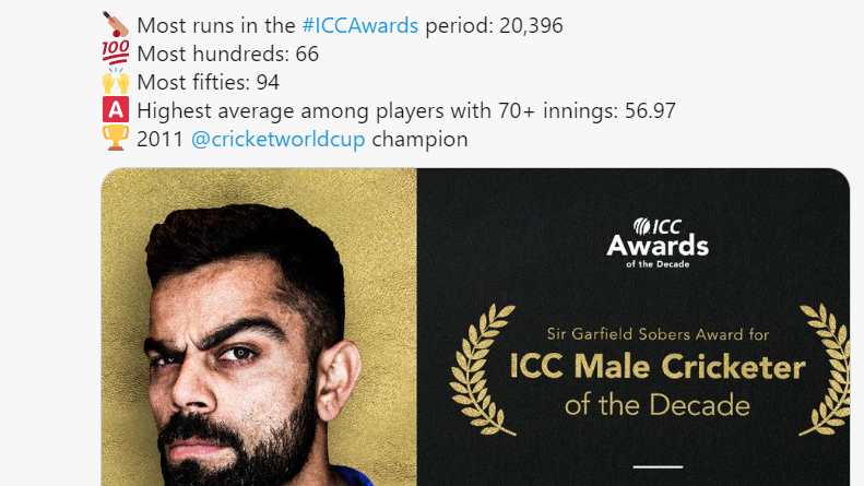 Read moreभारतीय कप्तान विराट कोहली को आईसीसी ने चुना दशक का सर्वश्रेष्ठ वनडे पुरुष क्रिकेटर, अंतर्राष्ट्रीय क्रिकेट को अलविदा कह चुके