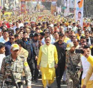 स्टेडियम ग्राउंड से प्रारंभ हुई कलश यात्रा नगर के प्रमुख मार्गों से होती हुई नवग्रह शक्ति पीठ मंदिर पहुंची।यात्रा में हाथी, ऊंट, घोड़े, रथ और खुले वाहनों में संतों की उपस्थिति ने दृश्य को अलौकिक बना दिया। मार्ग में जगह-जगह पुष्पवर्षा और स्वागत द्वारों से श्रद्धालुओं का अभिनंदन किया गया।