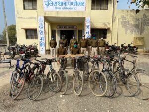 जानकारी के अनुसार साइकिल चोरी की घटनाओं के बाद पुलिस लगातार चोरों की तलाश कर रही थी। इसी दौरान पंडोखर पुलिस ने एक साइकिल चोर रामनरेश पुत्र गोविंददास निवासी तड़ोल थाना शाजापुर जिला झांसी का चोरी की गई साइकिल के साथ सदका तिराहे से पकड़ लिया गया। साइकिल चोर से पूछतांछ करने पर उसके द्वारा कुल 10 साइकिलें चोरी की घटनाओं को अंजाम देना स्वीकारा गया। आरोपित के बताए अनुसार अलग-अलग स्थानों से चोरी की गई कुल 10 साइकिलें बरामद की गई। आरोपित पूर्व में भी साइकिल चोरी की घटना को अंजाम दे चुका है ।