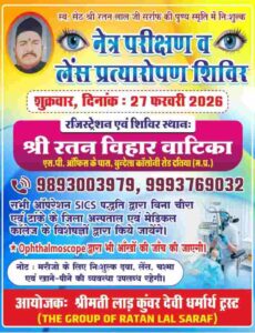 दतिया। हर साल की तरह इस वर्ष भी शहर में सामाजिक सरोकार से जुड़ा एक महत्वपूर्ण स्वास्थ्य शिविर रतन लाल सर्राफ परिवार द्वारा आयोजित किया जा रहा है। 27 फरवरी को स्वर्गीय सेठ रतन लाल सर्राफ की पुण्य स्मृति में एक दिवसीय निःशुल्क नेत्र परीक्षण एवं लेंस प्रत्यारोपण शिविर लगाया जाएगा। यह शिविर  रतन विहार वाटिका, एसपी ऑफिस के पास, बुंदेला कॉलोनी रोड, दतिया में आयोजित होगा। आयोजन श्रीमती लाड़ कुंवर देवी धर्मार्थ ट्रस्ट (द ग्रुप ऑफ रतन लाल सर्राफ) द्वारा किया जा रहा है।
