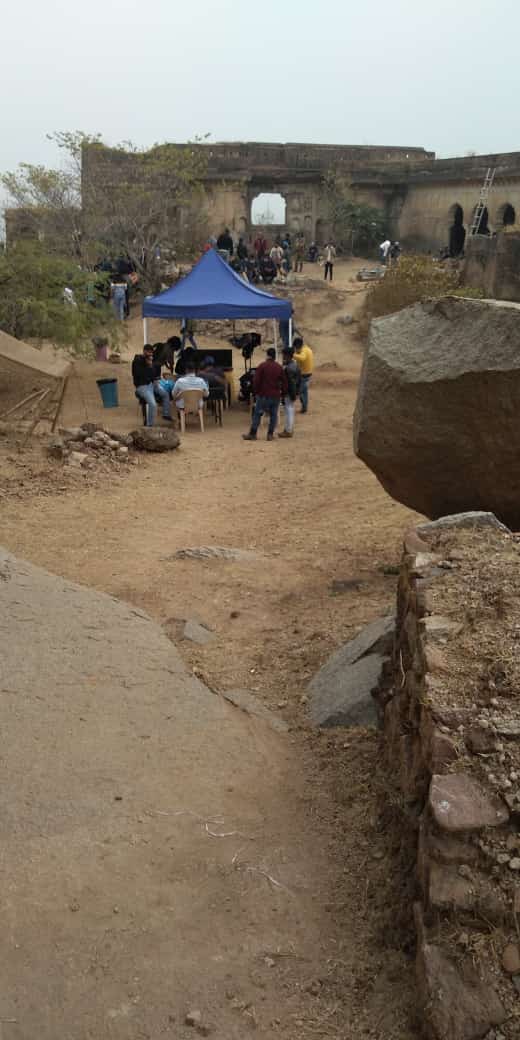 फिल्म यूनिट के वाहनों का काफिला एवं किले के बाहर खड़ी वैनिटी वैन.