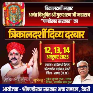 Datia news : दतिया। पण्डोखर सरकार धाम के पीठाधीश्वर गुरुशरण जी महाराज का दिव्य दरबार सागर के देवरी में 12, 13 एवं 14 अक्टूबर को आयोजित किया जाएगा।