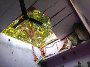Datia News : दतिया। बुधवार-गुरूवार की मध्यरात्रि को तेज हवा के शहर सहित ग्रामीण क्षेत्रों में भी बंूदाबांदी हुई। इसी दौरान बसई क्षेत्र के ग्राम बरधुवां में बारिश के दौरान एक मकान पर तेज गड़गडाहट के साथ बिजली गिरने से मकान की छत ढह गई। गनीमत यह रही कि बिजली गिरने के दौरान वहां कोई मौजूद नहीं था नहीं तो बड़ा हादसा घटित हो जाता।